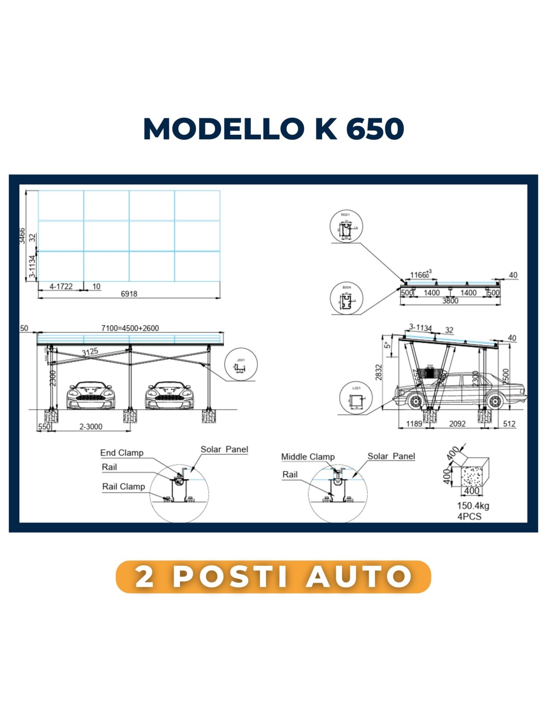 Pergola fotovoltaica K650 per 2 auto: struttura in alluminio con pannelli solari integrati. Protezione veicoli e produzione energetica green.