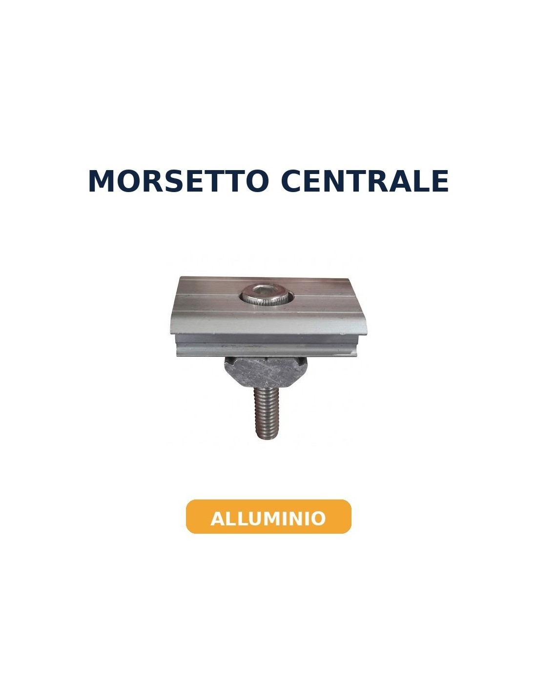 Morsetto centrale in alluminio anodizzato con vite: ideale per impianti fotovoltaici e strutture metalliche. Resistente agli agenti atmosferici.
